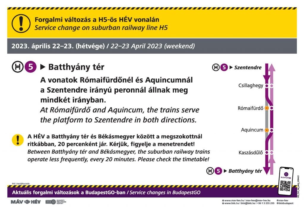 Karbantartás miatt 2023. április 22-én és 23-án (szombaton és vasárnap) a H5-ös HÉV módosított menetrend szerint, a Batthyány tér és Békásmegyer között a megszokottnál ritkábban jár. A vonatok Aquincumnál és Rómaifürdőnél a Szentendre irányú peronoknál állnak meg mindkét irányban.
